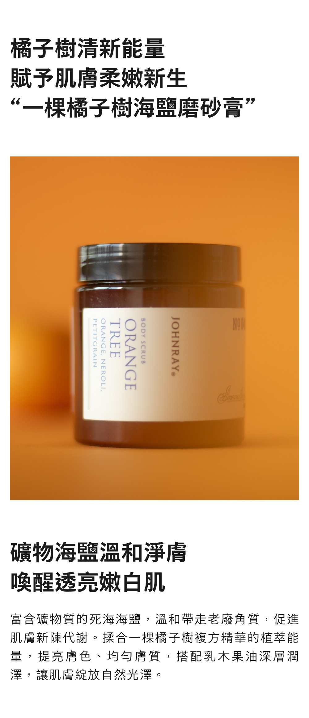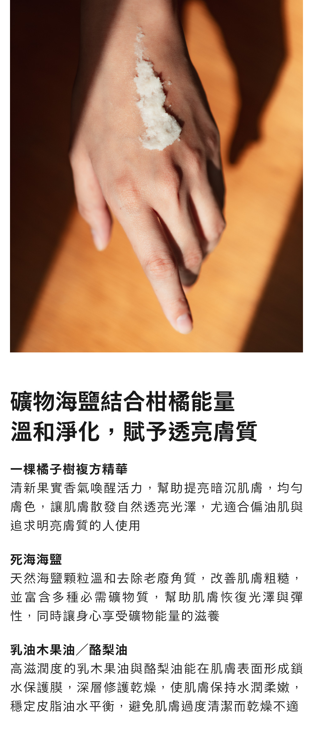 富含礦物質的死海海鹽,溫和帶走老廢角質,促進肌膚新陳代謝。揉合一棵橘子樹複方精華的植萃能量,提亮膚色、均勻膚質,搭配乳木果油深層潤澤,讓肌膚綻放自然光澤。